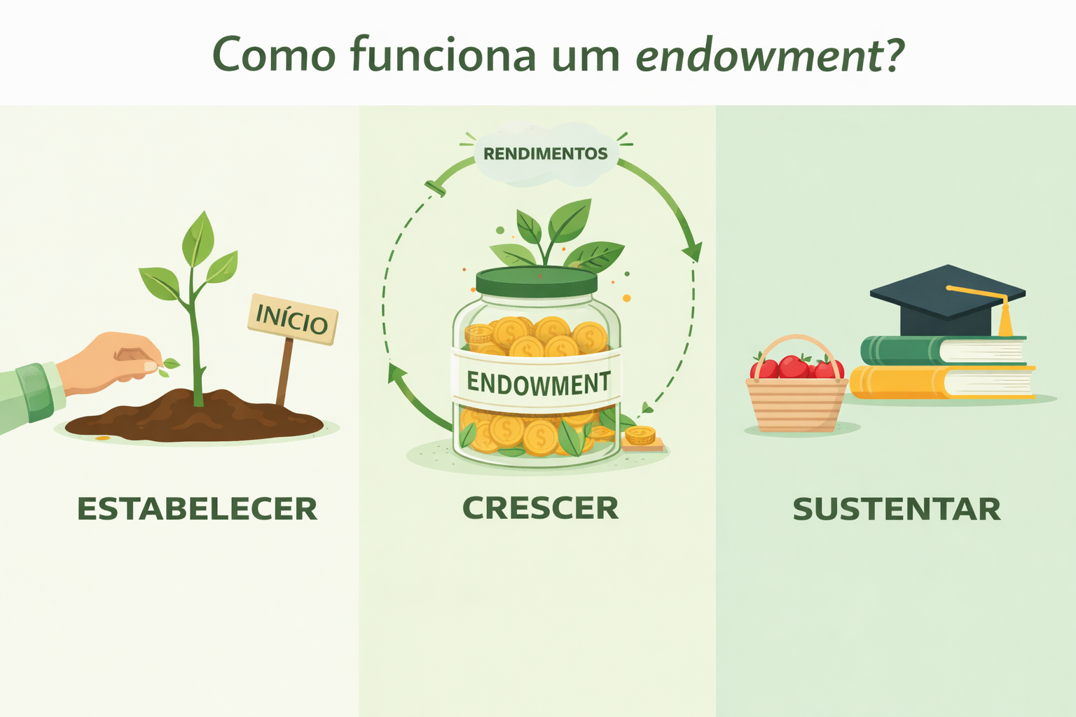Um endowment, ou fundo patrimonial, é um mecanismo financeiro estruturado para garantir sustentabilidade no longo prazo. Nesse modelo, os recursos doados não são utilizados diretamente, mas investidos com o objetivo de preservar o patrimônio principal. Apenas os rendimentos gerados por esses investimentos são utilizados para financiar atividades e projetos, como bolsas de estudo, pesquisa ou iniciativas institucionais. Dessa forma, cria-se uma fonte contínua de recursos, capaz de apoiar gerações ao longo do tempo, sem esgotar o capital inicial.